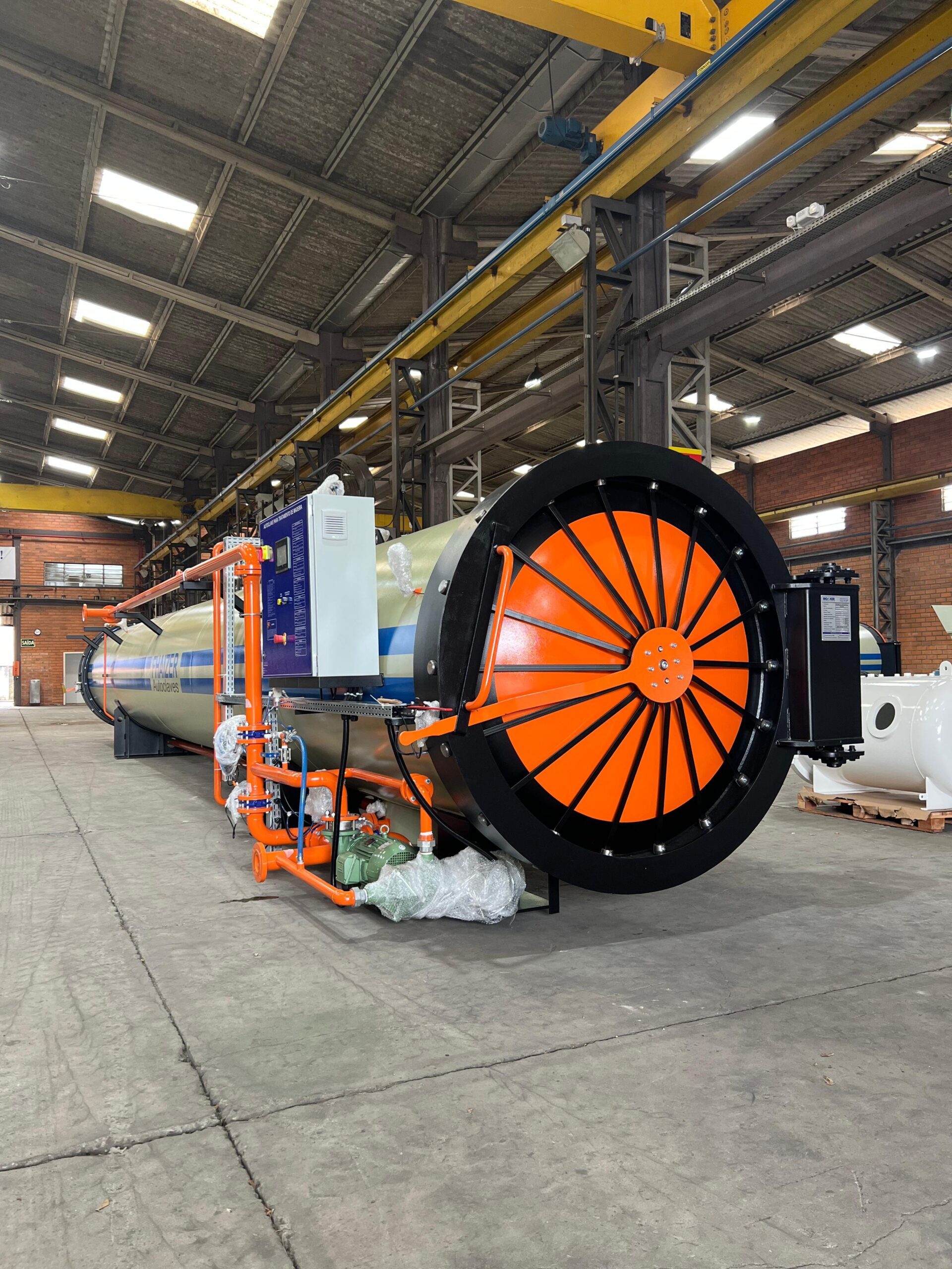 Autoclave para tratamento de madeiras com duas portas.
